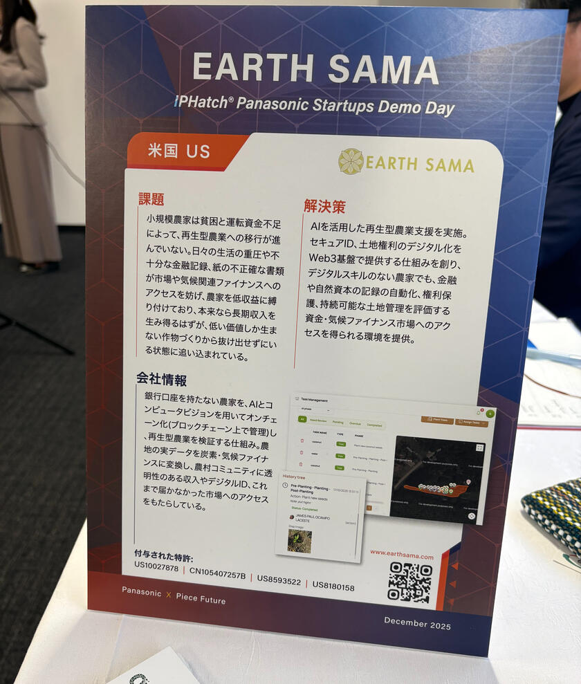 Earth Sama’s proprietary technology integrates zero-knowledge proof (ZKP)–based identity verification and biometric authentication to enable low-friction access for first-time digital participants. Built on a Web3 sovereign blockchain infrastructure, AI-driven voice guidance and large-format interfaces support structured field data collection, while participation-based incentives drive the generation of verified, compliance-ready data.Earth Sama owns three patents in computer vision and object detection, originally developed and commercialized through Casio and Panasonic.